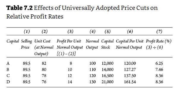 Before proceeding to the numerical example, it should be noted that I discovered an error while checking the calculations in table 7.2, column 3.. In the table, the selling price of the commodities produced is assumed to be $89.50. The unit cost — or cost price — is subtracted from the selling price to calculate the profit per unit. The result is then rounded up by .50 in column 3 in table 7.2. A rounding up of this magnitude would never be done in real-world business accounting. On checking, Shaikh’s profit rates matched my corrected results, Shaikh did the profit rate calculation correctly but careful readers should watch for the error.